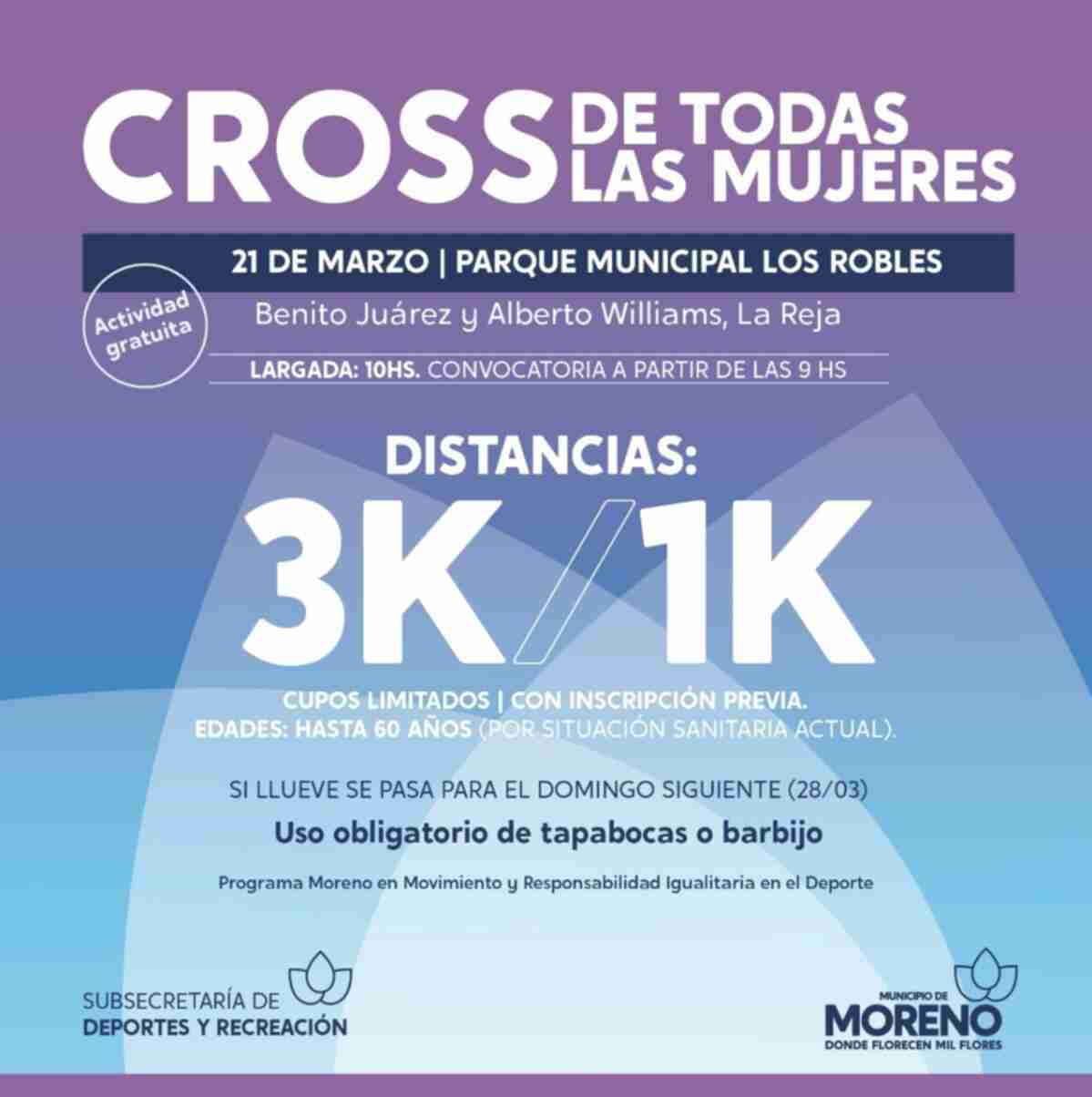 En el marco del mes de la Mujer, el próximo 21 de marzo tendrá lugar el “cross de todas las mujeres” de 3k y 1k, en el Parque Municipal Los Robles (Benito Juárez y Alberto Williams) de la localidad de La Reja, de forma gratuita.