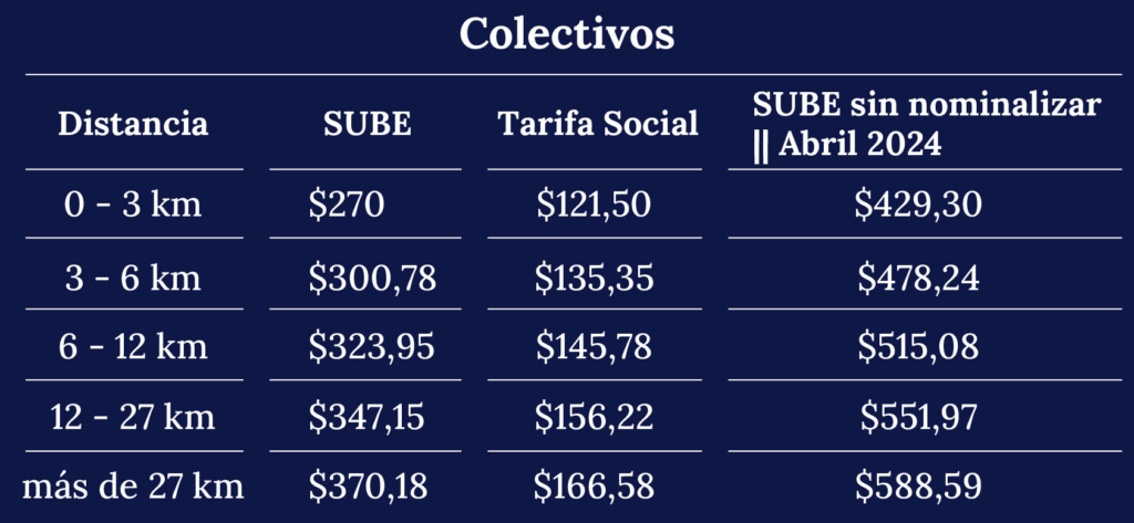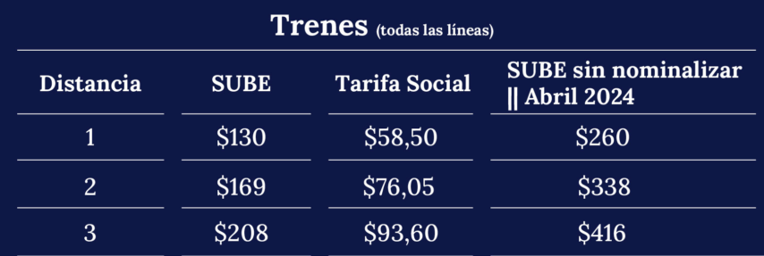 El boleto mínimo de colectivos pasó a valer $270 y el de trenes $130, mientras que el máximo es de $370 de colectivos y $208 de trenes. Las personas que tengan su SUBE registrada pagarán el mismo monto. Quienes no hayan realizado el registro pagarán $430 y $420 de mínimo, mientras que el máximo es de $588 y $416.