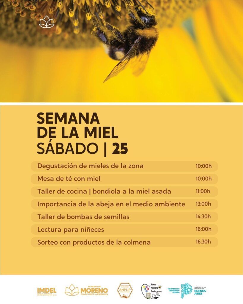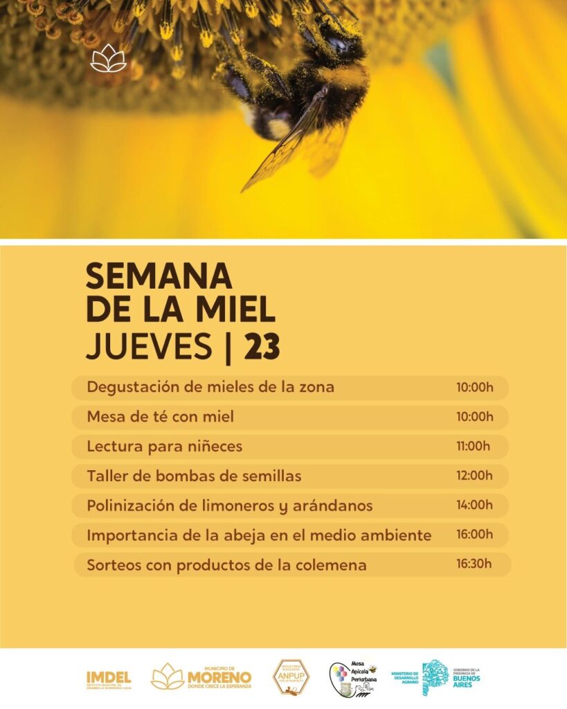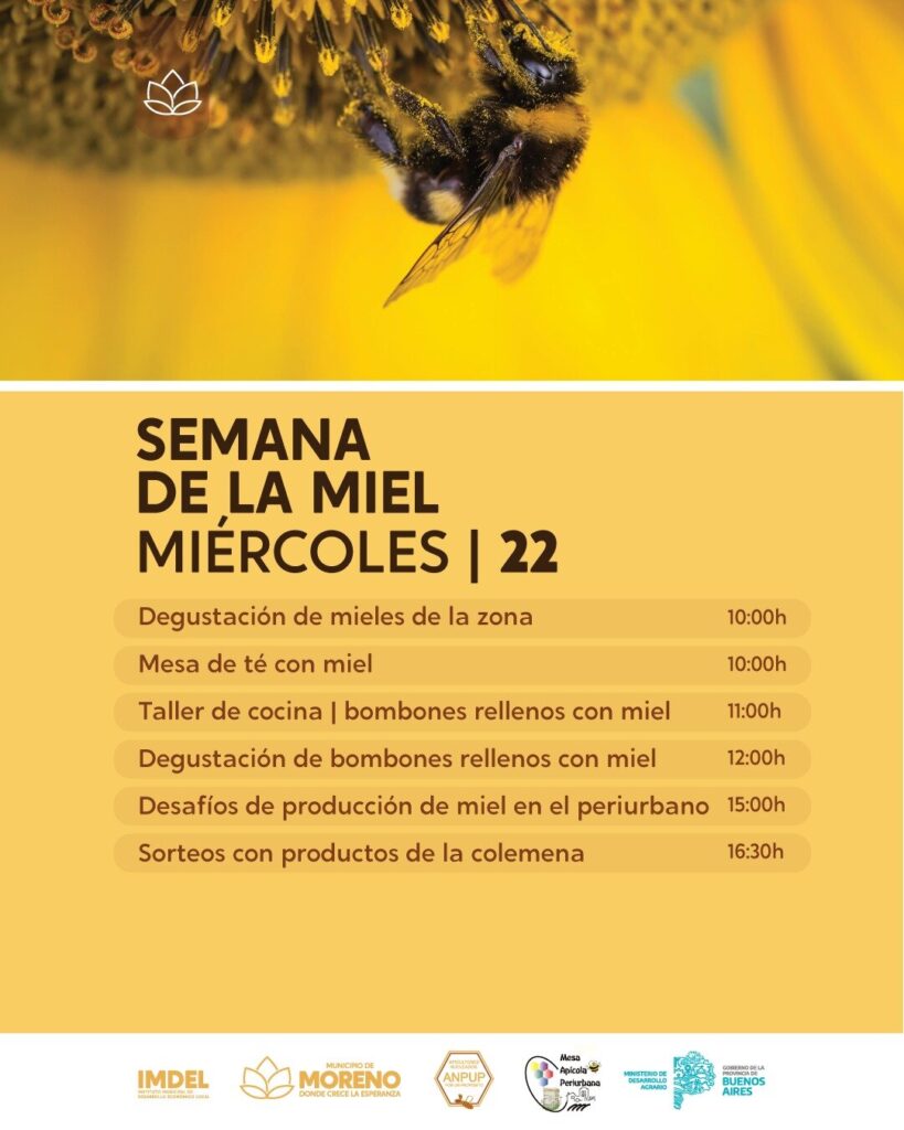 El Municipio de Moreno y el Instituto Municipal de Desarrollo Económico Local (IMDEL) llevan a a cabo esta iniciativa en la plaza San Martín ubicada en Bartolomé Mitre y Avenida Libertador hasta el 24 de este mes de mayo, y continuará los días 25 y 26 en la Reserva Natural Municipal “Los Robles”, ubicada en Benito Juárez y Alberto Williams. Este importante evento contará con charlas y talleres relacionados a la actividad apícola y cómo esta contribuye con la biodiversidad ambiental y la producción de alimentos. Además, habrá sorteos, exposiciones, degustaciones y variedad de productos.