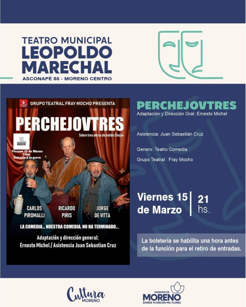 El viernes 15 de marzo, a las 21 horas, se presentará en el Teatro Municipal “Leopoldo Marechal”, ubicado Asconapé 85, la obra «Perchejovtres», bajo la dirección y adaptación de Ernesto Michel. La trama transcurre en el escenario de algún teatro, donde tres actores ya retirados están acomodando la escenografía del espectáculo a realizarse en ese momento y, a golpe de recuerdos, se encuentran inmersos en tres obras breves del cuentista, dramaturgo y médico ruso Antón Chejov.