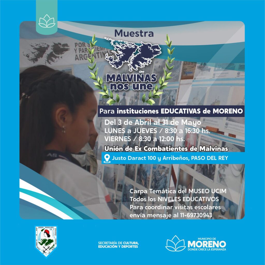 Desde la Secretaría de Cultura, Educación y Deportes municipal, junto a la Unión de Combatientes de las Islas Malvinas Moreno (UCIM), en la ciudad morenense se lleva adelante la muestra “Malvinas nos une”. La misma estará disponible hasta el día 31 de mayo en la carpa temática del Museo UCIM.