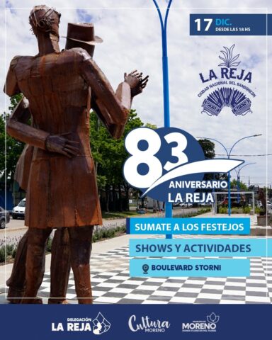 El Municipio de Moreno celebrará el aniversario N°83 de la localidad de La Reja el día domingo 17 de diciembre, a partir de las 18 horas, en el Boulevard Storni, La Reja.