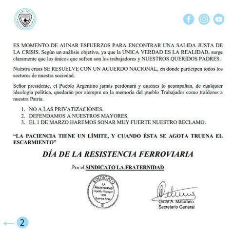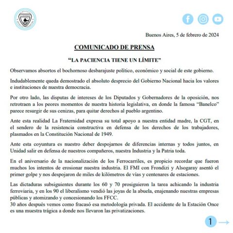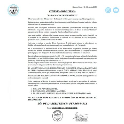 Asimismo, el sindicato que agrupa a maquinistas de locomotoras y trenes señaló que la medida se adoptará «dentro del reconocimiento explícito del derecho constitucional argentino ya que como decía el General Perón ‘dentro de la ley, todo; fuera de la ley, nada'».