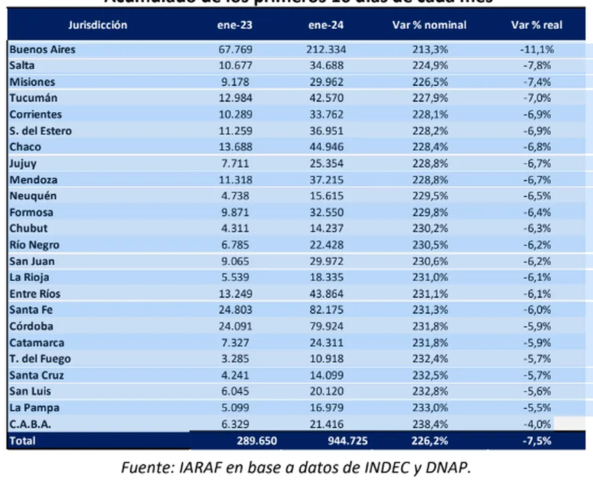 En ránking de provincias más afectadas por la caída de transferencias automáticas es encabezado con Buenos Aires, que perderá más de 11 puntos si se consolida la tendencia de la primera quincena. Le siguen salta Salta (-7,8%) y Misiones (-7,4%).