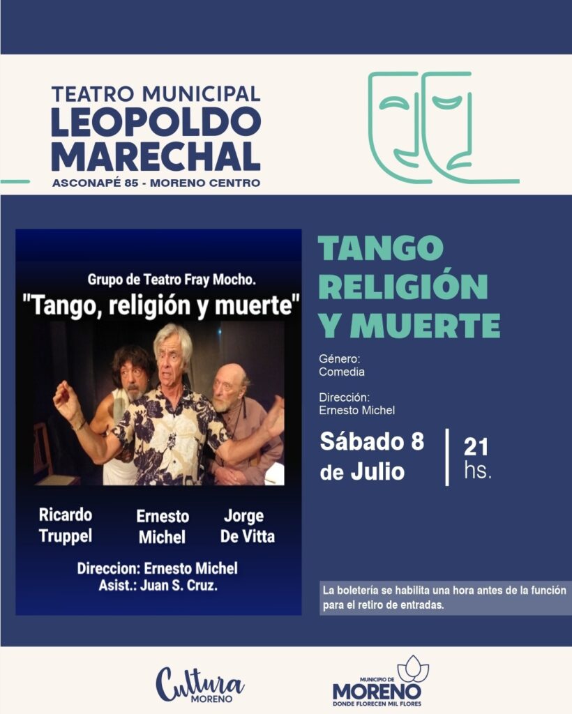 Mientras, el sábado, a las 21 horas, en el teatro Municipal Leopoldo Marechal, el grupo de teatro Fray Mocho presentará la obra “Tango, muerte y religión”, bajo la dirección de Ernesto Michel. Una disparatada comedia en la que tres amigos que se reencuentran después de 30 años en una situación hilarante, restableciendo el vínculo perdido. Un homenaje a la amistad donde se combina el humor, el tango y la ternura de un encuentro postergado por el tiempo y la búsqueda de nuevos horizontes.