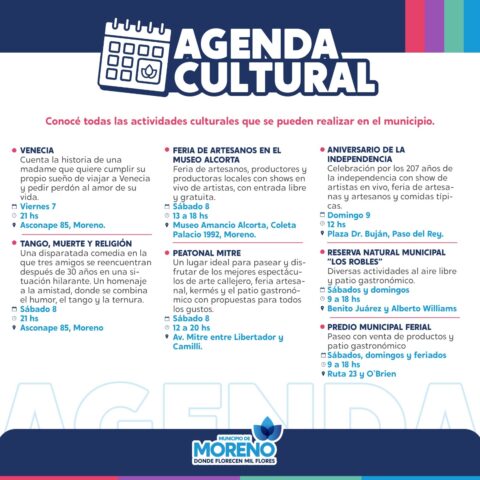 Como cada fin de semana, el Municipio brinda una variedad de propuestas culturales y turísticas para que pueda disfrutar la comunidad local y provincial. Entre los eventos que estarán acompañando este fin de semana están las obras «Venecia» y “Tango, muerte y religión”, en el Teatro Marechal; la Peatonal Mitre de Moreno; el Predio Municipal Ferial y la celebración por el 207° Aniversario de la Independencia en la Plaza Buján, entre otros. Y como siempre, las actividades recreativas que brinda La Reserva Municipal Los Robles.