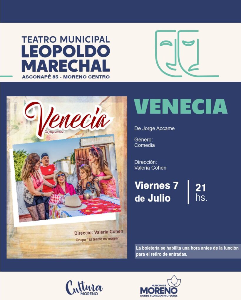 El día viernes 7, a las 21 horas, se presentará en el teatro Municipal “Leopoldo Marechal”, ubicado en Asconapé 85, la obra “Venecia”, bajo la dirección de Valeria Cohen. Se trata de un clásico del humor nacional escrito por Jorge Accame, que cuenta la historia de una madama que quiere cumplir su viejo sueño de viajar a Venecia y pedirle perdón al amor de su vida.