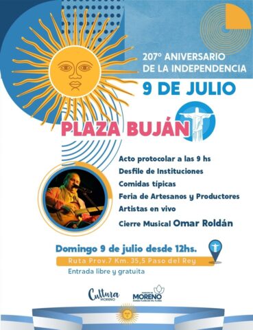 El domingo 9 de julio, se festejará el “207° Aniversario de la Independencia”, desde las 12 horas, en la plaza Doctor Buján, ubicada en Ruta 7, kilómetro 35,5, en Paso del Rey. Se realizará a las 9 horas un acto protocolar, habrá desfile de instituciones y se podrá disfrutar en familia del patio gastronómico con comidas típicas y de la feria de artesanos y productores locales. Además, habrá shows musicales en vivo y el cierre del evento estará a cargo del folkorista Omar Roldán.