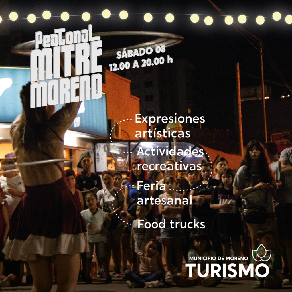 A su vez, el sábado 8, se desarrollará la Peatonal Mitre de Moreno desde las 12 hasta las 20 horas. Un lugar ideal para pasear y disfrutar de los mejores espectáculos de arte callejero, feria artesanal, actividades recreativas, foodtrucks, kermés y el patio gastronómico, con propuestas para todos los gustos.