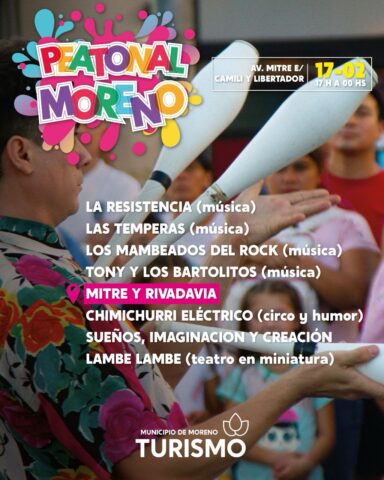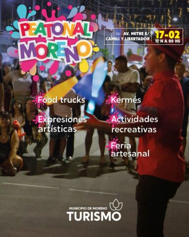 El sábado 17, de 17 a 00 horas se desarrollará la “Peatonal Moreno”, sobre la Avenida Mitre y Rivadavia, con espectáculos gratuitos para toda la familia. Donde se puede disfrutar de números de arte callejero y circenses, bandas de música, espectáculos de títeres y shows para las infancias. También, se puede recorrer el paseo artesanal con más de 60 puestos, juegos de kermese y degustar los variados menús del sector gastronómico.
