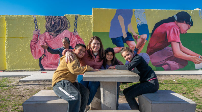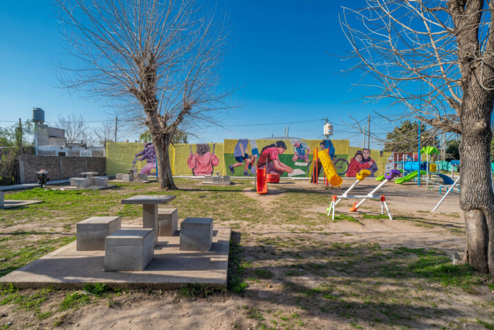 La recorrida de la intendenta continuó en la plaza Ayelén, donde el Municipio instala nuevos juegos, mobiliario urbano y realiza murales para embellecer el espacio público, destinado a la recreación y disfrute de las vecinas y vecinos.