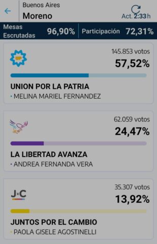 La intendenta Mariel Fernández es reelegida con más del 57% de los votos y va por su segundo mandato en Moreno. Con el 97% de las mesas escrutadas, la candidata de Unión por la Patria superó a la lista de La Libertad Avanza por más de 33 puntos, que obtuvo el 24% de los votos, en tercer lugar quedó la lista de Juntos por Cambio con el 13% y en cuarto lugar, el Frente de Izquierda con el 4%.