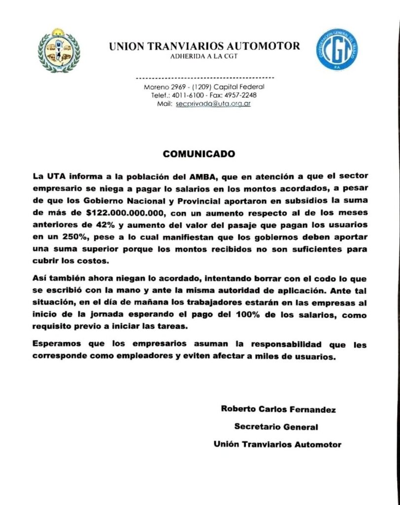 Luego de la reunión, la UTA emitió un comunicado a la población del AMBA donde explican los motivos que llevan al gremio a tomar esta decisión de fuerza mayor. En el mismo, explican que las empresas de transporte se niegan a pagar los salarios en los montos acordados, a pesar de haber recibido los subsidios correspondientes por parte del gobierno nacional y provincial: “La UTA informa a la población del AMBA que en atención a que el sector empresario se niega a pagar los salarios en los montos acordados, a pesar de que el Gobierno nacional y Provincial aportaron en subsidio la suma de $122.000.000.000, con un aumento respecto al meses anteriores de 42% y aumento del valor del pasaje que pagan los usuarios en un 250% pese a lo cual manifiestan que los gobiernos deben aportar una suma superior porque los montos recibidos no son suficientes para cubrir los costos”.