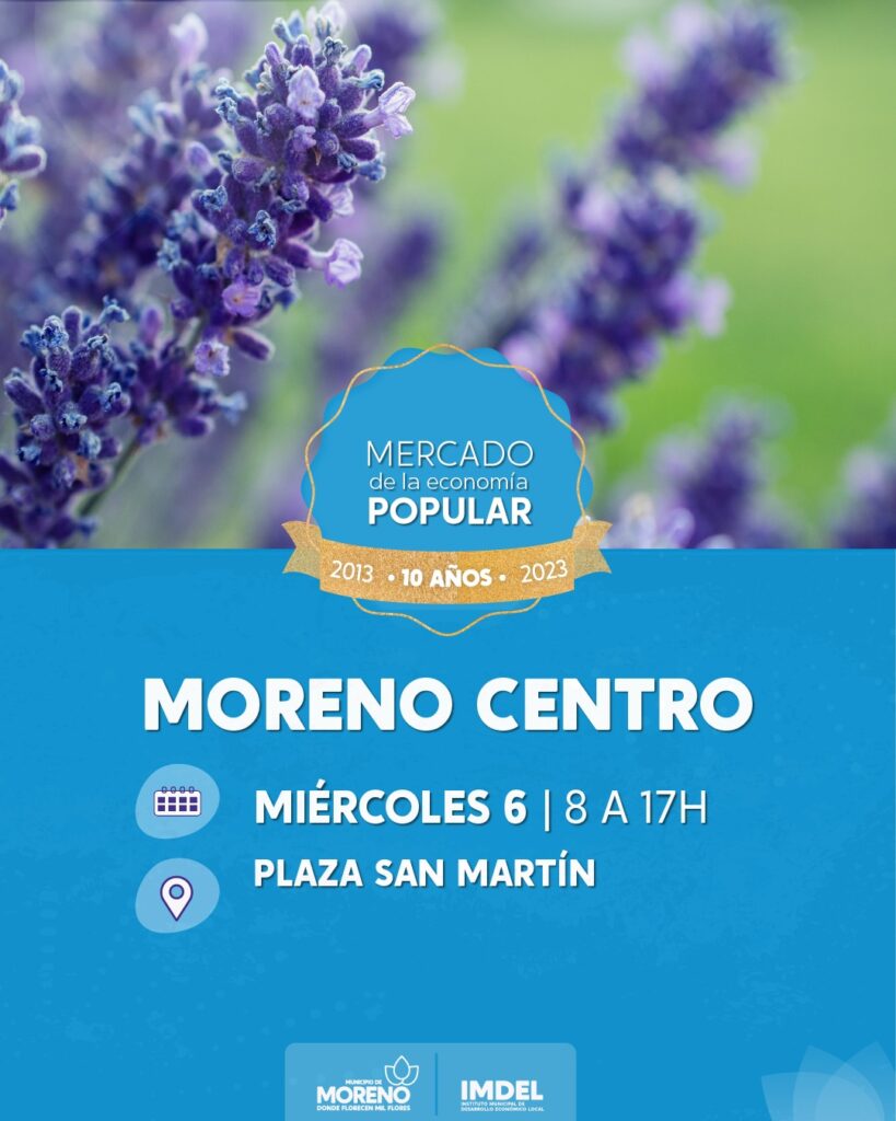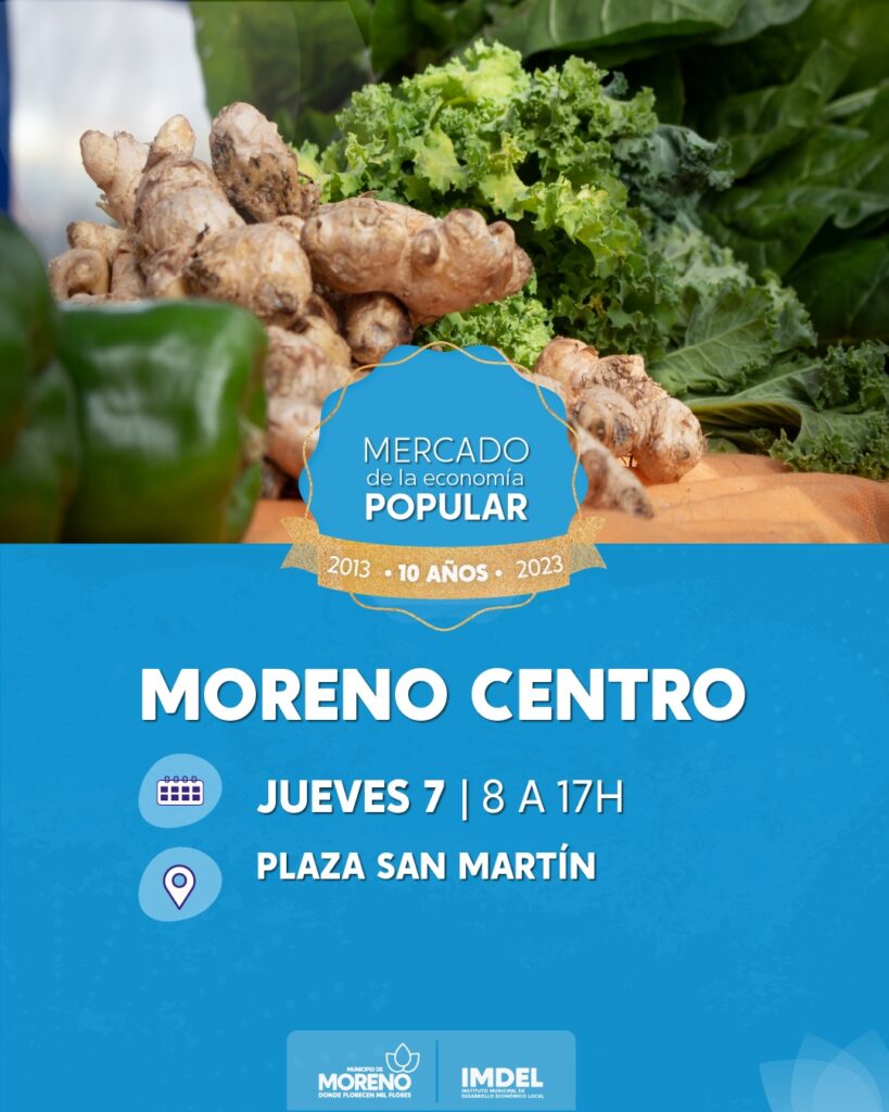 El Mercado de la Economía Popular se lleva a cabo los días miércoles y jueves en la Plaza San Martín, y de forma itinerante en los distintos barrios de Moreno. En él trabajan cientos de productores y productoras locales que ofrecen a vecinos y vecinas de Moreno frutas, verduras agroecológicas, pastas, lácteos, pescado y mariscos, carnes, miel, huevos, panificados, plantas y productores textiles.