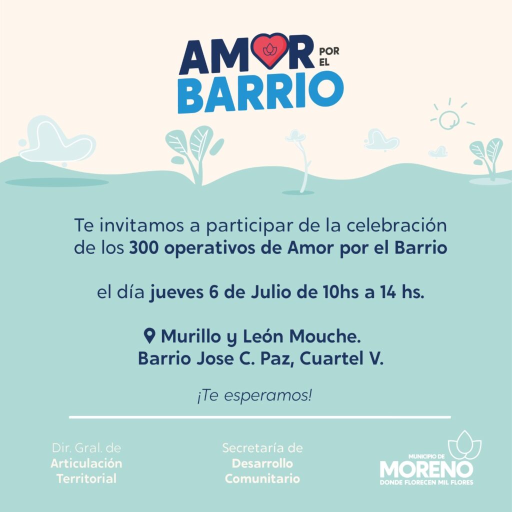 El Municipio de Moreno, a través de la Secretaría de Desarrollo Comunitario, celebra las 300 jornadas del operativo “Amor por el Barrio”, el día jueves 6 de julio de 10 a 14 horas en Murillo y León Bouche, en la localidad de Cuartel V.