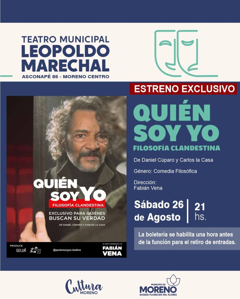 Además, el domingo, a las 20 horas se presentará una segunda función de la obra “Quién soy Yo. Filosofía clandestina”, en el Teatro Municipal “Leopoldo Marechal”. Una obra dirigida y protagonizada por Fabián Vena. Una pieza encantadora, vital, necesaria y exclusiva para quienes tienen la valentía de encontrarse con su propia verdad.