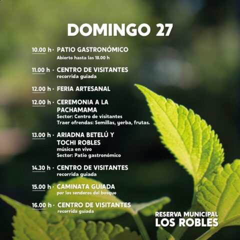 El domingo 27, a las 12 horas, continúan las celebraciones por el “Mes de la Pachamama” con una serie de festejos para el respeto y el cuidado de la casa común en la Reserva Natural Municipal “Los Robles”.
