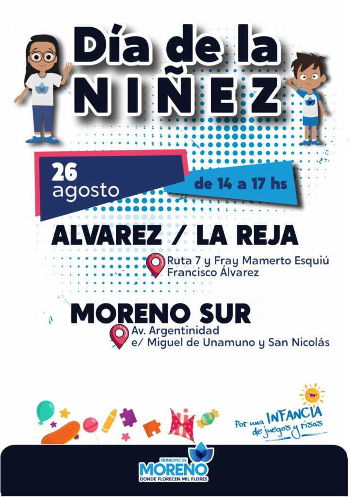 El sábado 26, de 14 a 17 horas continúan las actividades de recreación por el Día de las Infancias. Durante este fin de semana podrán disfrutar de la proyección de películas, juegos y shows que se desarrollarán el sábado en Ruta 7 y Fray Mamerto Esquiú, Francisco Álvarez y en la Avenida Argentinidad entre Miguel de Unamuno y San Nicolás, Moreno Sur. También el domingo 27, en el Polideportivo Catonas, ubicado en José ingenieros 3250 en Moreno Norte.