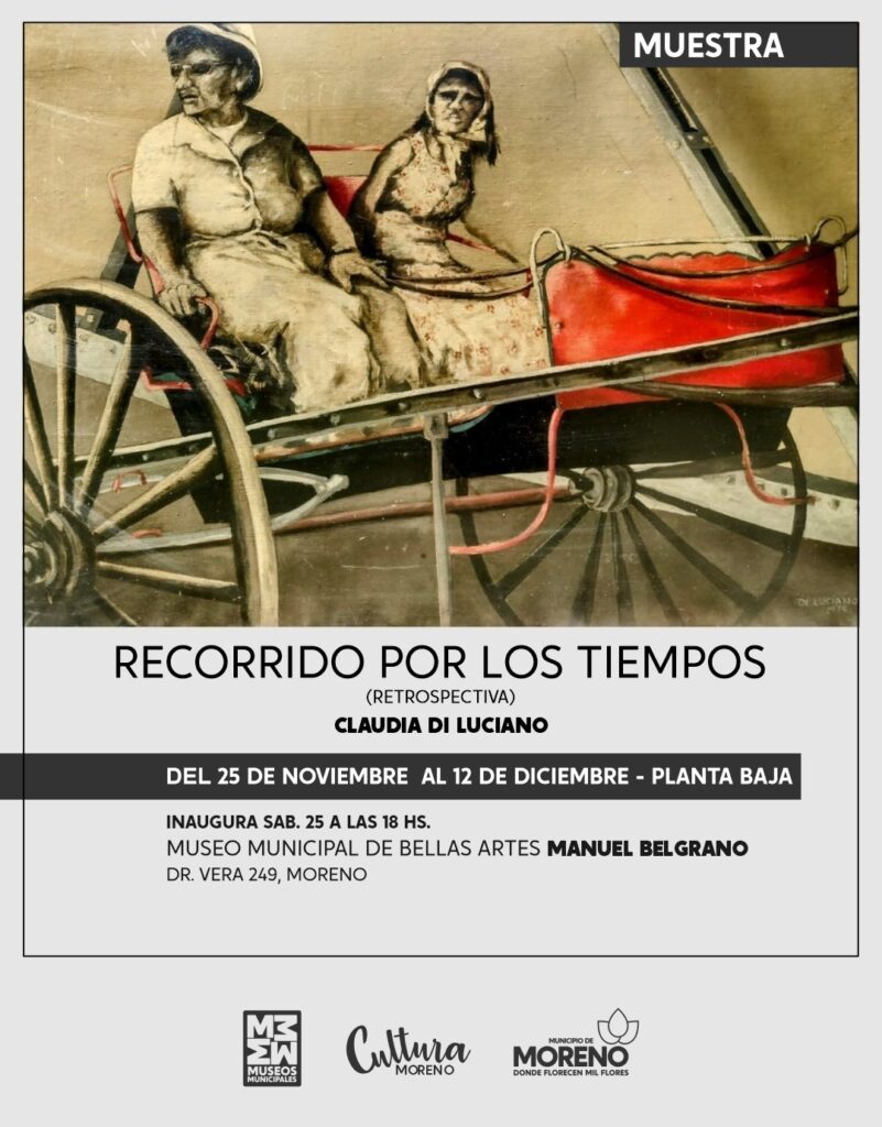 El sábado 25, a las 19 horas se inaugurará la muestra “Recorrido por los tiempos”, una retrospectiva de Claudia Di Luciano, en la planta baja del Museo Municipal “Manuel Belgrano”. De entrada libre y gratuita. La misma podrá visitarse hasta el 12 de diciembre.