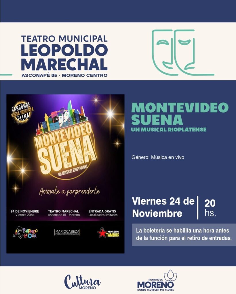 Además, el viernes 24, a las 20 horas, se presentará en el Teatro Municipal “Leopoldo Marechal”, ubicado en Asconapé 85, el espectáculo musical “Montevideo suena”, con la participación especial de Jesús Fernández y La Murga estilo Uruguayo. Una obra musical que propone un viaje sonoro por la esencia de tres ritmos emblemáticos: el candombe, la murga y la plena.