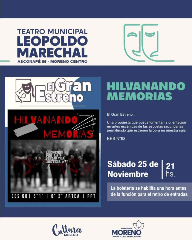 También el sábado, a las 21 horas se estrenará, en el teatro Leopoldo Marechal, la obra “Hilvanando Memorias”, realizada por alumnos de la Escuela Secundaria N° 68. Una propuesta teatral que mediante interrogantes trata dar respuestas, mediante una serie de relatos, sobre el entramado de la memoria colectiva al cumplirse 40 años de democracia.