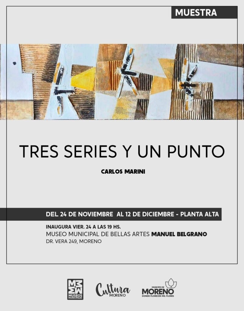 El viernes 24 de noviembre, a las 19 horas se inaugurará la muestra “Tres series y un punto”, de Carlos Marini, en la planta alta del Museo Municipal “Manuel Belgrano”, ubicado en Doctor Vera 247. De entrada libre y gratuita. La misma podrá visitarse hasta el 12 de diciembre.