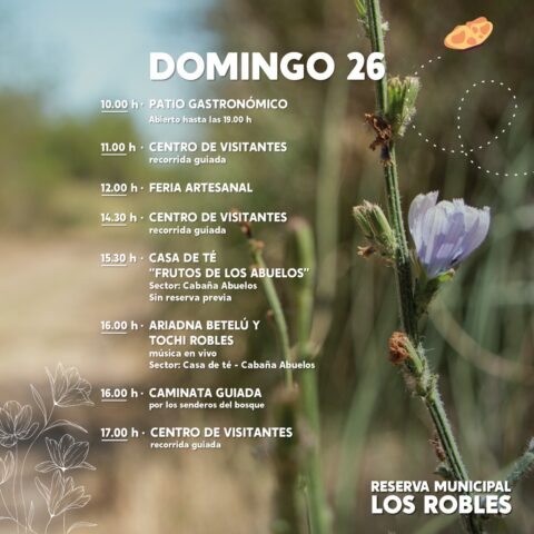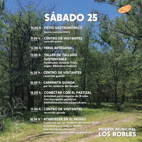 El sábado 25, de 10 a 19 horas, se podrá disfrutar del patio gastronómico; y a partir de las 12 horas, estará disponible la feria artesanal. En tanto a las 11, como a las 14:30 y las 17 horas, se realizará la recorrida guiada por el Centro de Visitantes. A las 13 horas, en el sector de la biblioteca Padoani, se brindará un taller de talado sustentable a cargo de Esteban Tello.