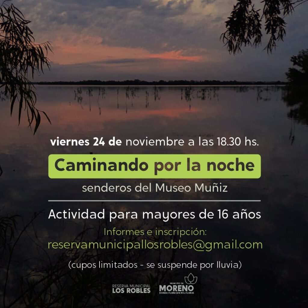 El viernes 24, a las 18.30 horas se podrá participar de la actividad “Caminando por la noche – senderos del Museo Muñiz”m un actividad destinada a mayores de 16 años, con inscripción previa al correo reservamunicipallosrobles@gmail.com. La misma es con cupos limitados y se suspende por lluvia.
