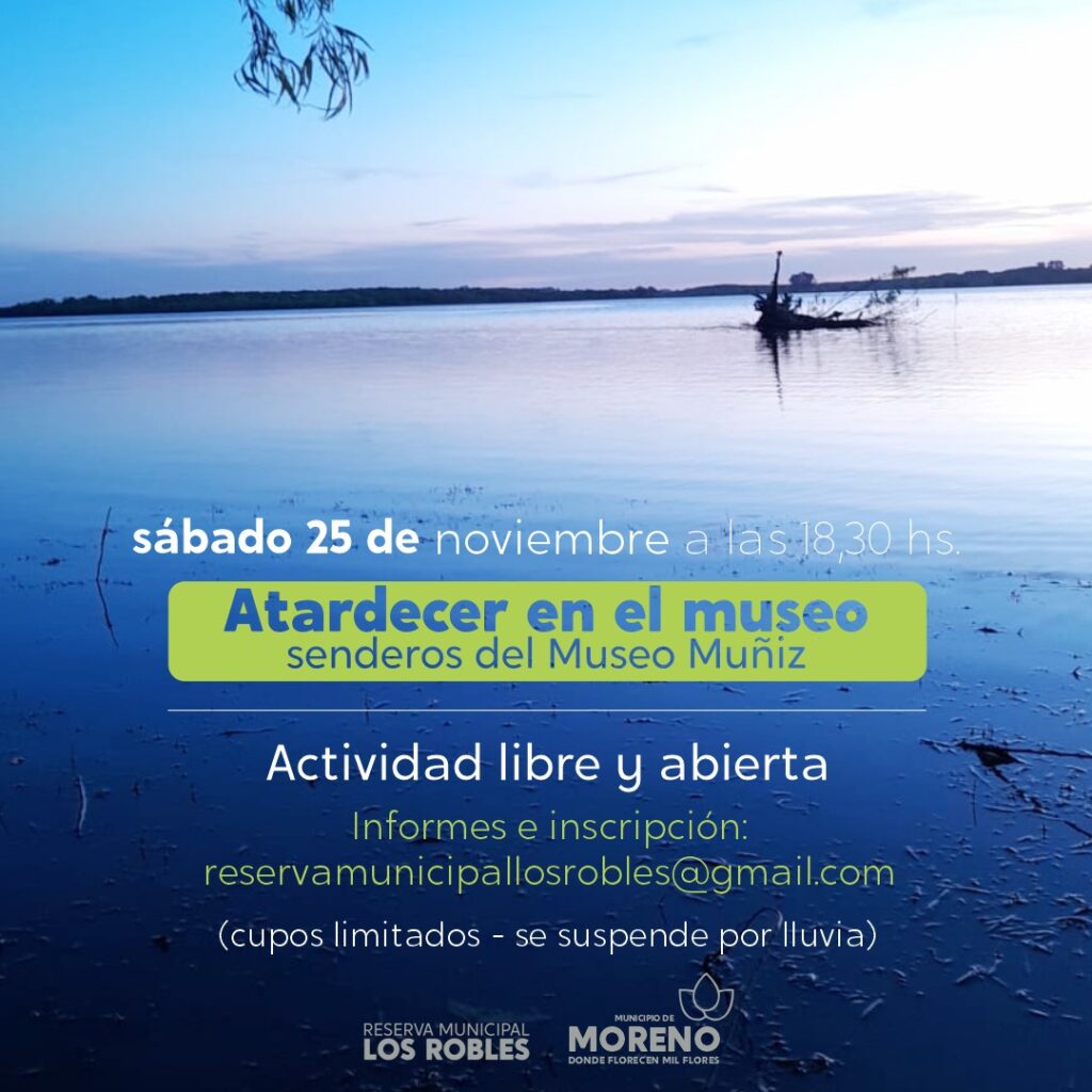También, a las 18:30 horas se podrá participar de la actividad libre y abierta “Atardecer en el Museo – senderos del Museo Muñiz”, para toda la familia. Informes e inscripción previa por e-mail: reservamunicipallosrobles@gmail.com. La misma es con cupos limitados y se suspende por lluvia.