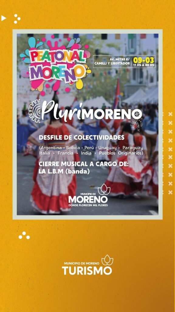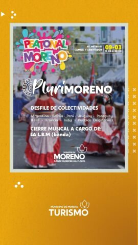 En esta oportunidad continuará el desfile “PluriMoreno” de representación multicultural de las colectividades de Argentina, Bolivia, Perú, Uruguay, Italia, Francia, India y los distintos pueblos originarios que viven, producen y se desarrollan en el distrito. El evento contará con un cierre musical en vivo a cargo de la banda “La L.B.M”.