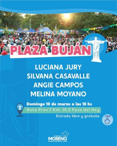 El domingo 10, desde las 18 horas, se podrá disfrutar de shows en vivo en la plaza Buján, de Paso del Rey, donde se presentarán en vivo las artistas musicales Luciana Jury, Silvana Casavalle, Angie Campos y Melina Moyano.