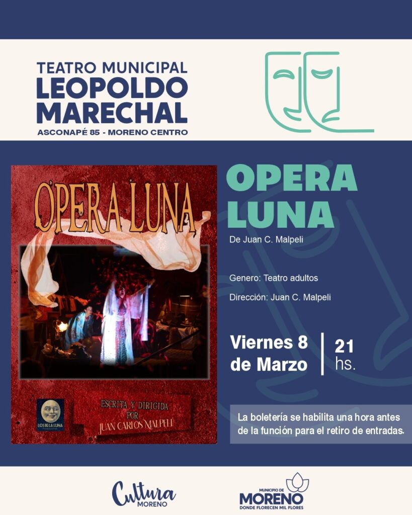 El viernes 8 de marzo, a las 21 horas, se presentará en el Teatro Municipal “Leopoldo Marechal”, ubicado Asconapé 85, la obra «Ópera Luna», dirigida por Juan Carlos Malpeli. Dicha obra es producida íntegramente por artistas locales.