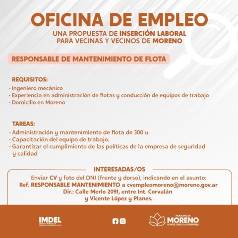 Los interesados deben enviar CV y foto del DNI (frente y dorso), indicando el asunto: Ref. Responsable de Mantenimiento a cvempleomoreno@moreno.gov.ar. Dirección: calle Merlo 2091 entre Intendente Corvalán y Vicente López y Planes.