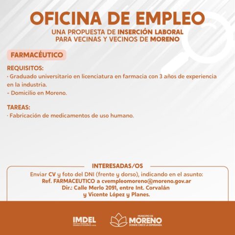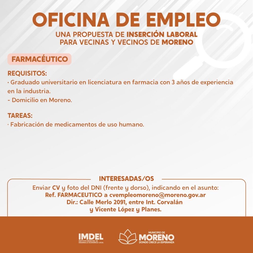 También se ofrece un puesto de Farmacéutico. Uno de los requisitos es ser graduado universitario en licenciatura en farmacia con tres años de experiencia en la industria, y domiciliado en Moreno.