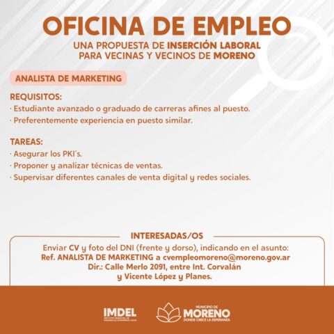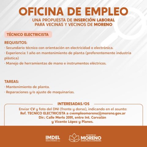 Desde la Oficina de Empleo local, dependiente del IMDEL, se publicaron nuevas propuestas de inserción laboral para vecinas y vecinos de Moreno. En esta oportunidad, la búsqueda está orientada a un técnico electricista, un farmacéutico, un responsable de mantenimiento de flota, y un analista de marketing. Las y los interesados pueden enviar el CV con foto de DNI (frente y dorso), indicando en el asunto el rubro al que se van a postular, al mail cvempleomoreno@moreno.gov.ar.