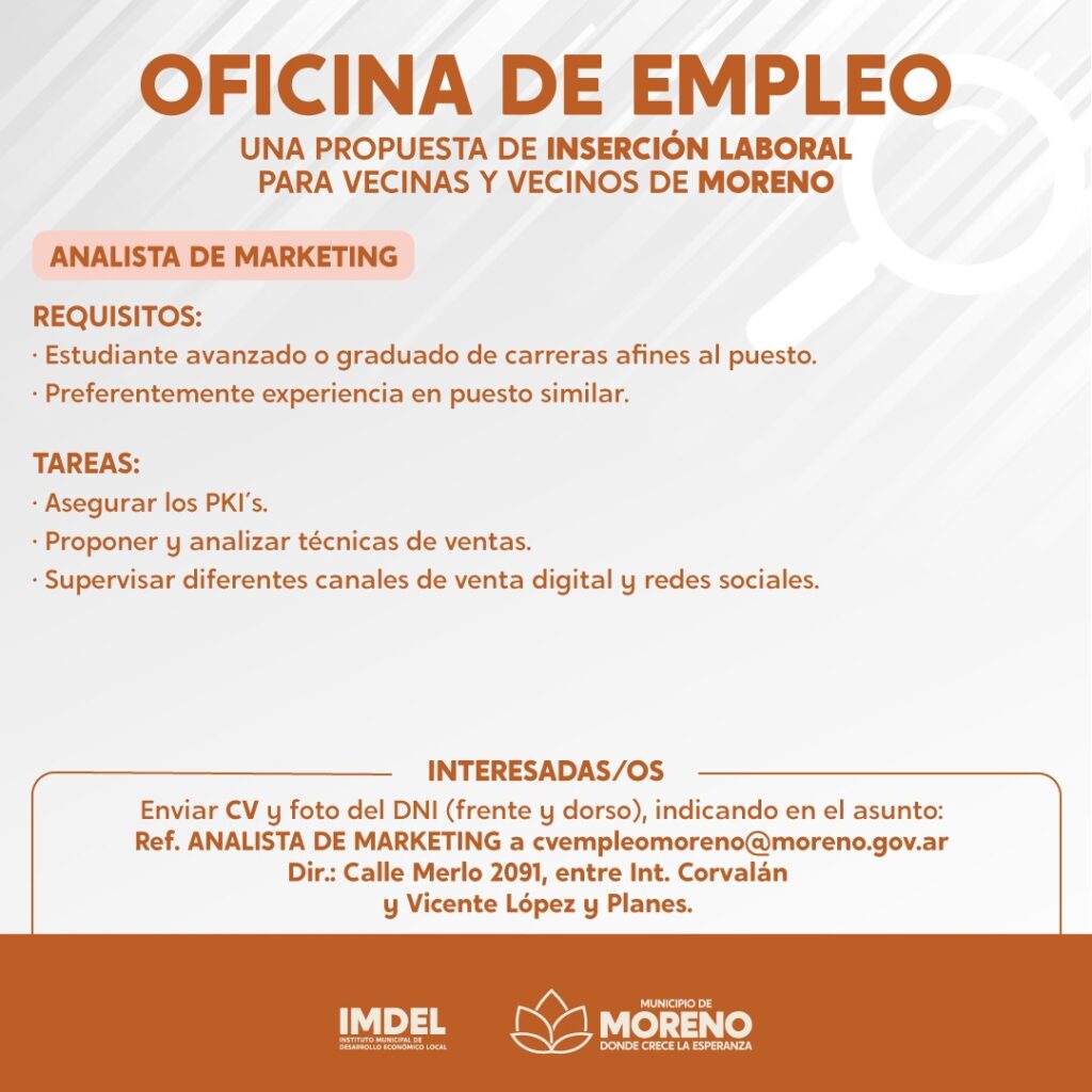 Una de las propuestas recientes de inserción laboral es para Analista de Marketing. Los requisitos son: estudiante avanzado o graduado de carreras afines al puesto, preferentemente experiencia en puesto similar.