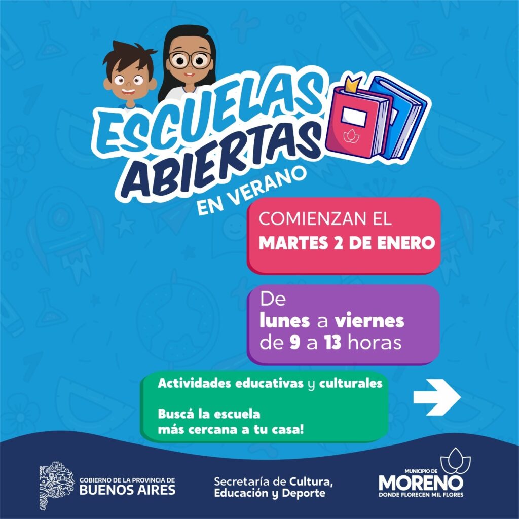 En Moreno se llevará adelante el programa “Escuelas abiertas en verano” a partir del día 2 de enero, hasta el 2 de febrero. Allí se brindaran actividades recreativas, culturales y educativas, destinadas a niñas, niños y jóvenes de hasta 18 años inclusive. Desde Moreno Primero, dialogamos con la secretaria de Cultura, Educación y Deporte, Cynthia Muñoz, quién explica que «este programa busca dar continuidad al Servicio Alimentario Escolar, ya que en este contexto es muy importante poder sostener, desde las instituciones educativas, el plato de comida de niñas, niños y jóvenes».
