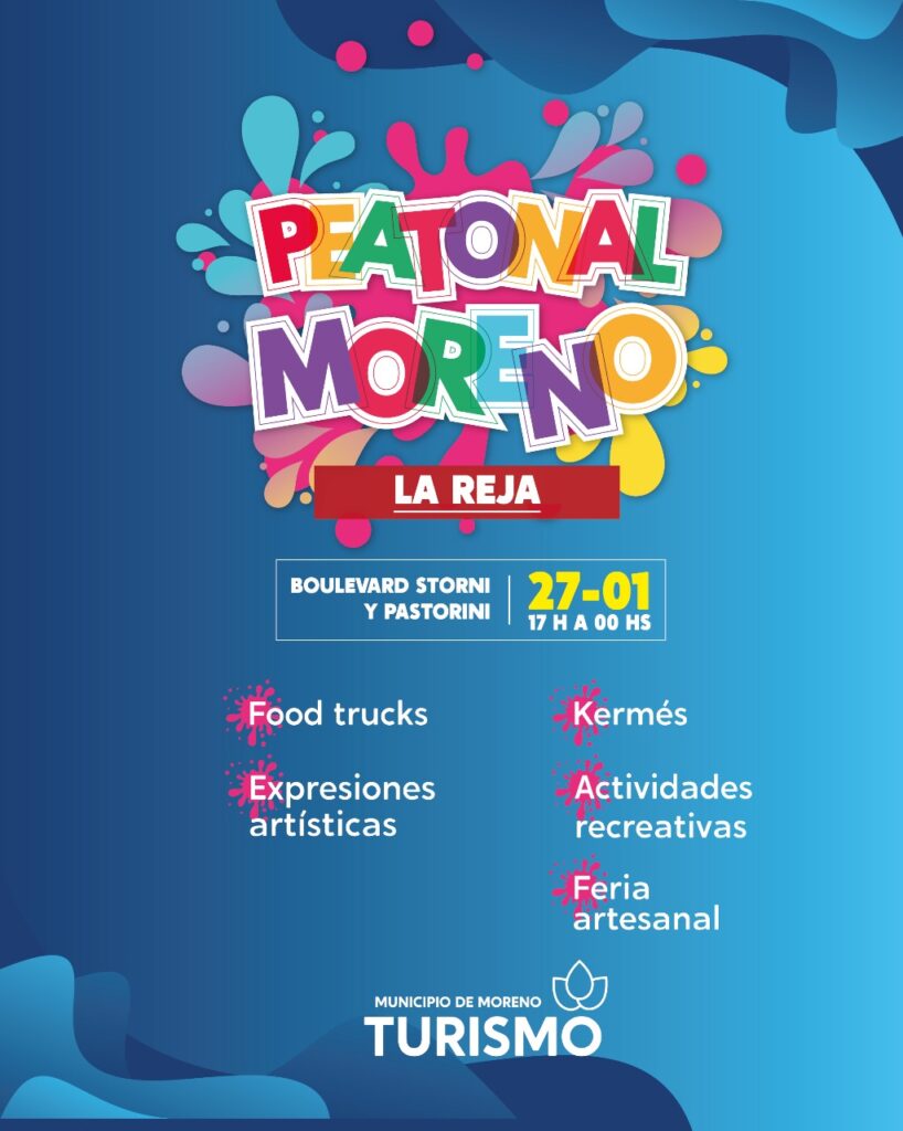 Asimismo el sábado, en la localidad de La Reja, se podrá participar de la Peatonal que se desarrollará desde las 17 hasta las 00 horas, en el Boulevard Storni y Pastorini. Allí se realizarán expresiones artísticas, actividades recreativas, kermés, food truks y feria artesanal.