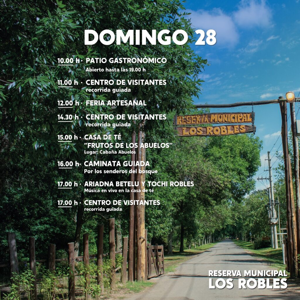 El domingo 28, de 10 a 19 horas, se podrá disfrutar del patio gastronómico y a partir de las 12 horas, estará disponible la feria artesanal. También, a las 11, 14:30 y 17 horas se realizará una recorrida guiada por el centro de visitantes. Mientras que a las 15 horas estará disponible la Casa de Té «frutos de los abuelos» para deleitarse con comidas e infusiones preparadas en el lugar, en la cabaña abuelos, a la que se puede asistir sin reserva previa.