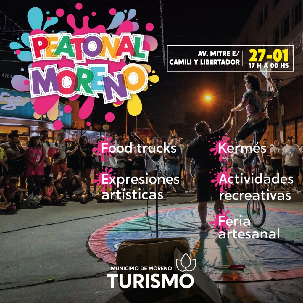 El sábado 27, de 17 a 00 horas se desarrollará la temporada 2024 de la “Peatonal Moreno”, sobre la Avenida Mitre y Rivadavia, con espectáculos gratuitos para toda la familia. Donde se puede disfrutar de números de arte callejero y circenses, bandas de música, espectáculos de títeres y shows para las infancias. También, se puede recorrer el paseo artesanal con más de 60 puestos, juegos de kermese y degustar los variados menús del sector gastronómico.
