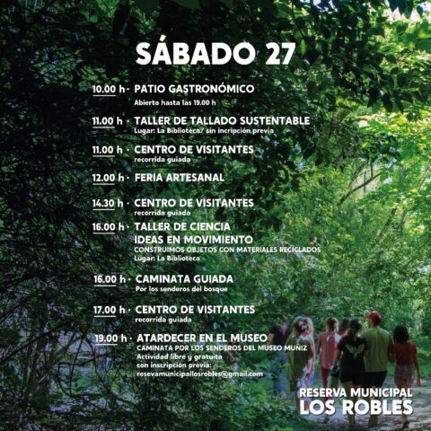A las 19 horas, se podrá participar de la actividad “Atardecer en el Museo”, una caminata por los senderos del Museo Muñiz, que requiere inscripción previa por correo electrónico a: reservamunicipallosrobles@gmail.com.