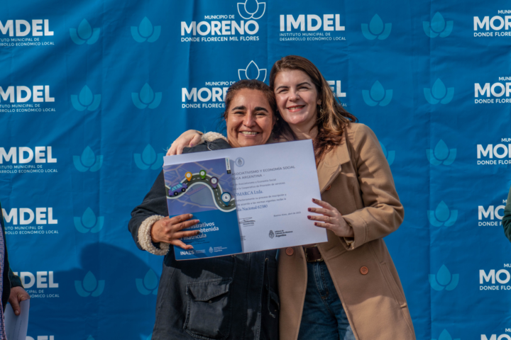 A comienzos del mes de junio, la intendenta de Moreno, Mariel Fernández, junto a la directora Nacional de Cumplimiento del Instituto Nacional de Asociativismo y Economía Social (INAES), Milagros Moya, entregaron herramientas y maquinarias a 12 cooperativas de trabajo por un valor de 15 millones de pesos, y 23 matrículas a cooperativas que fueron asesoradas y acompañadas por la Coordinación de Asociativismo y Microemprendimientos del Instituto Municipal de Desarrollo Económico Local (IMDEL).