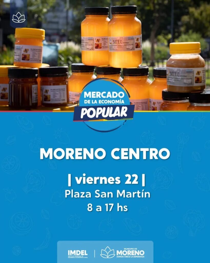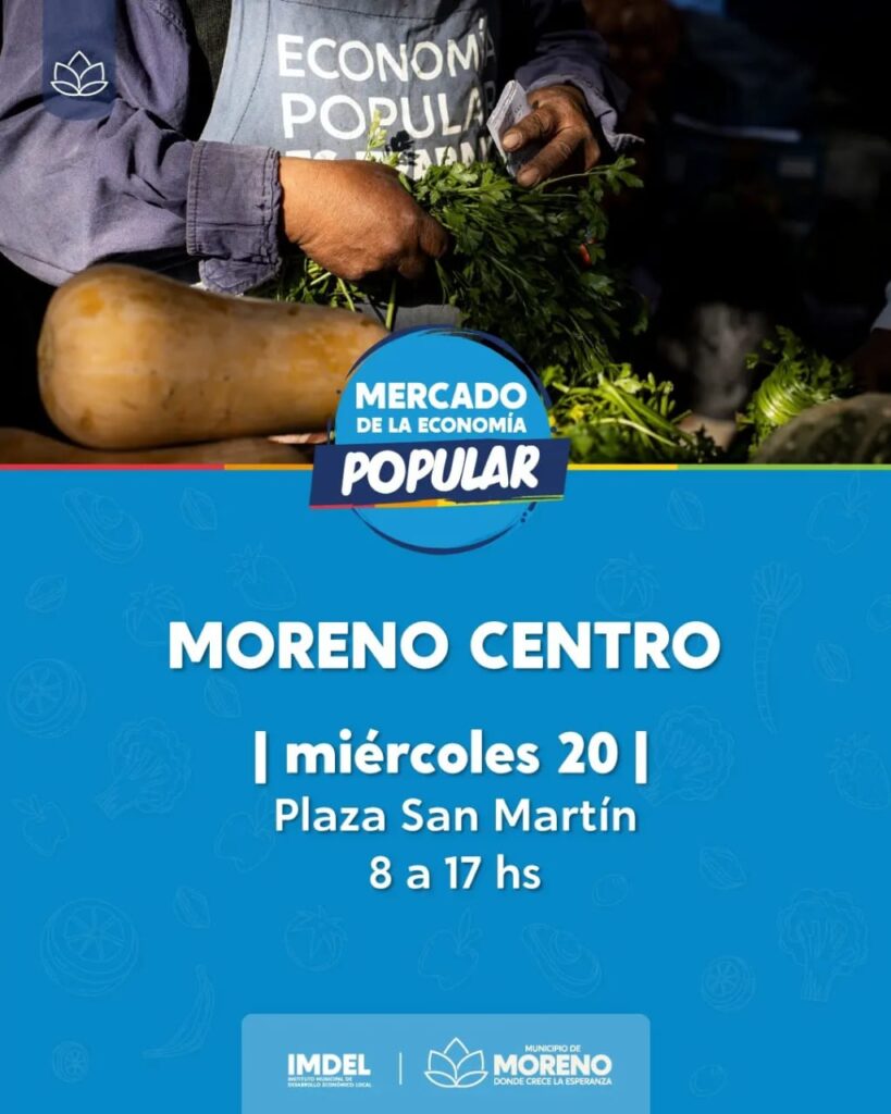 El Mercado de la Economía Popular se lleva a cabo los días miércoles y viernes en la Plaza San Martín, y de forma itinerante en los distintos barrios de Moreno. En él trabajan cientos de productores y productoras locales que ofrecen a vecinos y vecinas de Moreno frutas, verduras agroecológicas, pastas, lácteos, pescado y mariscos, carnes, miel, huevos, panificados, plantas y productores textiles.