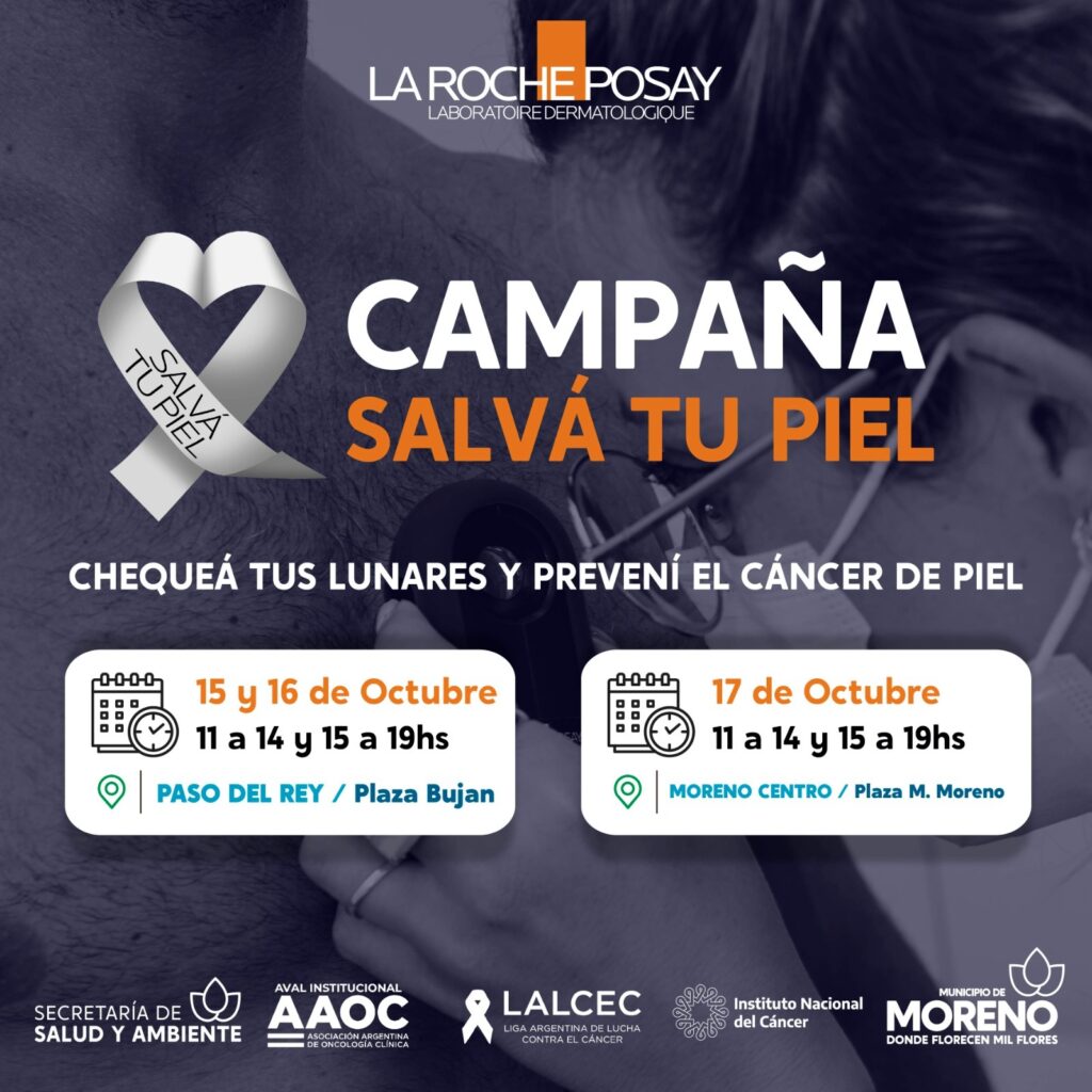 A través de la Secretaría de Salud y Ambiente, y en conjunto con el laboratorio La Roche-Posay, en Moreno se realizará la campaña “Salvá tu piel” los días 15, 16 y 17 de octubre, con el objetivo de concientizar y educar para la detección temprana del cáncer de piel que salva vidas.