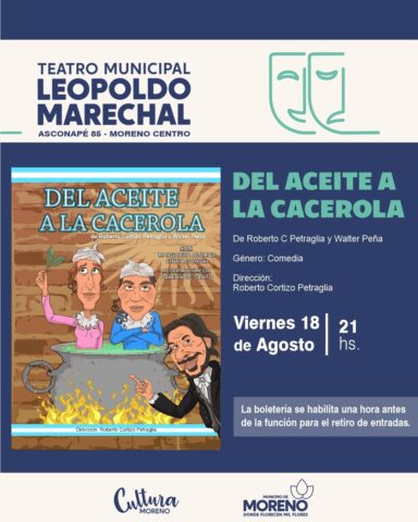 También este viernes 18, a las 21 horas, en el Teatro Municipal “Leopoldo Marechal”, ubicado en Asconapé 85, se presentará la obra “Del aceite a la cacerola”, bajo la dirección de Roberto Cortizo Petraglia. La misma trata sobre la historia argentina desde una cocina que bien podría ser la del fuerte antes de las invasiones inglesas o la cocina de la Casa Rosada actual. En ella, dos mujeres ideológicamente contrapuestas, están atrapadas en esta cocina mientras pasan los años. Una propuesta que intenta contar nuestra historia desde el humor y lo grotesco.