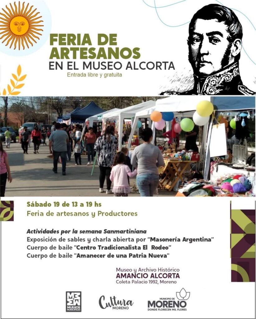 El mismo sábado 19, de 13 a 19 horas, se podrá disfrutar en familia de la Feria de Artesanos en el Museo “Amancio Alcorta”, ubicado en la rotonda Coleta Palacio 1992. En esta oportunidad se realizarán actividades por la Semana Sanmartiniana, donde habrá una exposición de sables y charla abierta a cargo de la Gran Logia de la Argentina de Libres y Aceptados Masones. Además, se presentarán los cuerpos de baile Centro Tradicionalista “El Rodeo” y “Amanecer de una Patria Nueva”. Con entrada libre y gratuita.