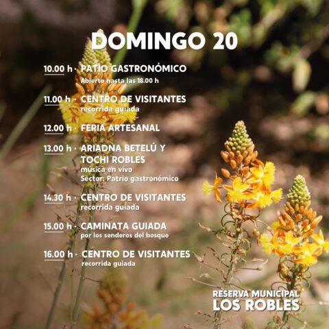 El domingo 20, de 10 a 18 horas, se podrá disfrutar del patio gastronómico; y desde las 12 horas estará disponible la feria artesanal. A las 13 horas, se presentarán, en el patio gastronómico, los artistas Ariadna Betelú y Tochi Robles con música en vivo.