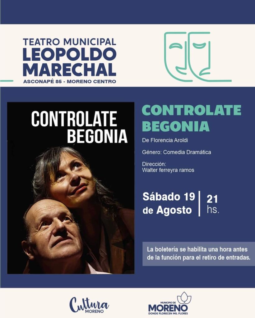 A su vez, el sábado, a las 21 horas se presentará, en el Teatro Municipal “Leopoldo Marechal”, la obra “Contrólate Begonia”, bajo la dirección de Walter Ferreyra Ramos. Begonia, regresa al país luego de una larga estadía en México. Un día tras una visita médica Begonia descubre que el médico que la atendió no es otro que José, su novio de la adolescencia. Juntos se sumergen en un viaje por los recuerdos más románticos, disparatados y revolucionarios que atravesaron su juventud y su pasado de estudiantes militantes cuando la sangrienta dictadura que los persiguió se instala entre ellos como una herida imposible de cerrar.