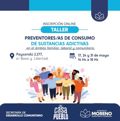 El municipio brindará una nueva capacitación de “Preventoras y Preventores de consumo de sustancias adictivas en el ámbito familiar, laboral y comunitario” los días 17, 24 y 31 de mayo, de 14 a 16 horas, en Paysandú 2277, entre Bossi y Libertad. Los talleres son gratuitos y abiertos a la comunidad y se entregarán certificados de asistencia. Desde Moreno Primero, dialogamos con la subsecretaria de Casa Pueblo, Florencia Dupont, quien destacó la importancia de las capacitaciones “porque trabajamos desde la idea que nos cuidamos en comunidad”. También se refirió al alcance de las jornadas de capacitación que se realizan constantemente y detalló otras acciones que realizan para la prevención de consumos problemáticos.