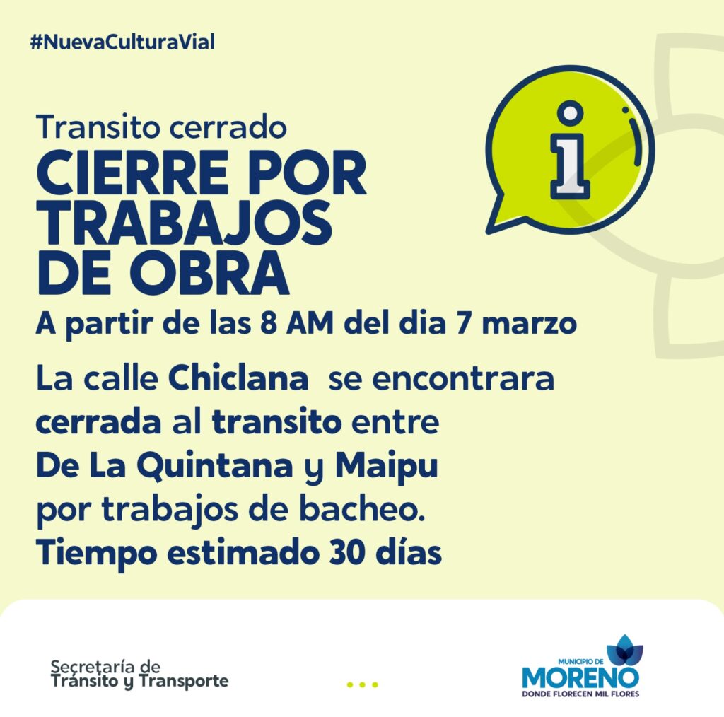 Por su parte, desde el 7 de marzo, a las 8:00 hs, no se puede transitar por la calle Chiclana. Se encuentra cerrada al tránsito entre las calles De La Quintana y Maipu, debido a trabajos de bacheo. Se estima que el tiempo de clausura es de 30 días.